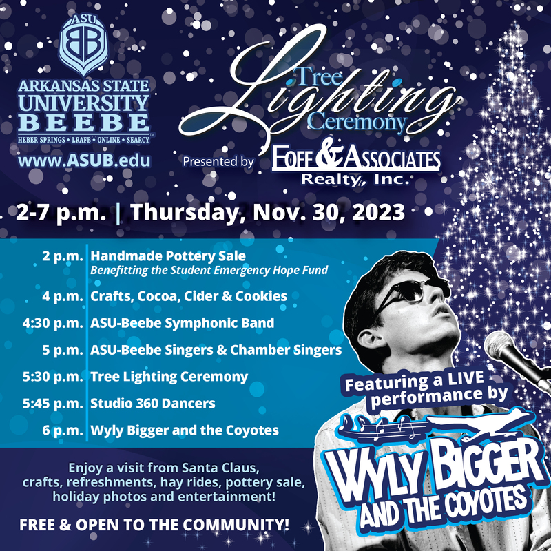 The ASU-Beebe Community Tree Lighting will take place in The Grove behind State Hall on the Beebe campus. It's a perfect opportunity for families, friends and the entire community to come together and celebrate the holiday season.